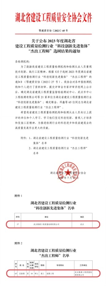 近日,湖北省建設(shè)工程質(zhì)量安全協(xié)會(huì)公布了2023年度湖北省建設(shè)工程質(zhì)量檢測行業(yè)“科技創(chuàng)新先進(jìn)集體”“杰出工程師”選樹結(jié)果,市政設(shè)計(jì)院所屬武漢路源工程質(zhì)量檢測有限公司(下稱“路源公司”)榮獲“科技創(chuàng)新先進(jìn)集體”稱號(hào),路源公司高級(jí)工程師吳勝強(qiáng)榮獲“杰出工程師”稱號(hào)。
