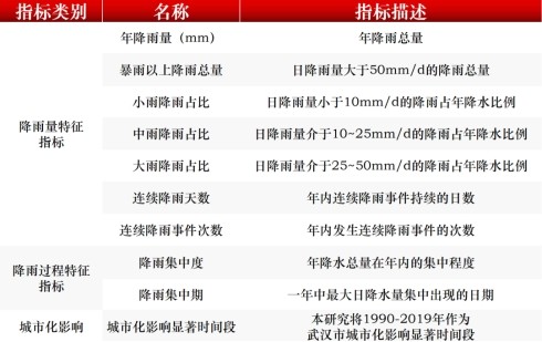 綜合考慮降雨量、降雨過程、城市化影響等因素,課題組構(gòu)建了一套多維度的降雨特征指標體系,在武漢及其他長江中下游地區(qū)平原型城市中具有較好的適用性。