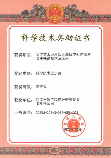 近日,2025年度湖北省科學技術(shù)獎獲獎名單正式公布。由武漢市政院深度參與研發(fā)的科研項目“臨江富水地層深大基坑變形控制與防滲關(guān)鍵技術(shù)及應(yīng)用”,憑借顯著的技術(shù)創(chuàng)新性與突出的工程應(yīng)用價值,榮獲湖北省科學技術(shù)進步三等獎。