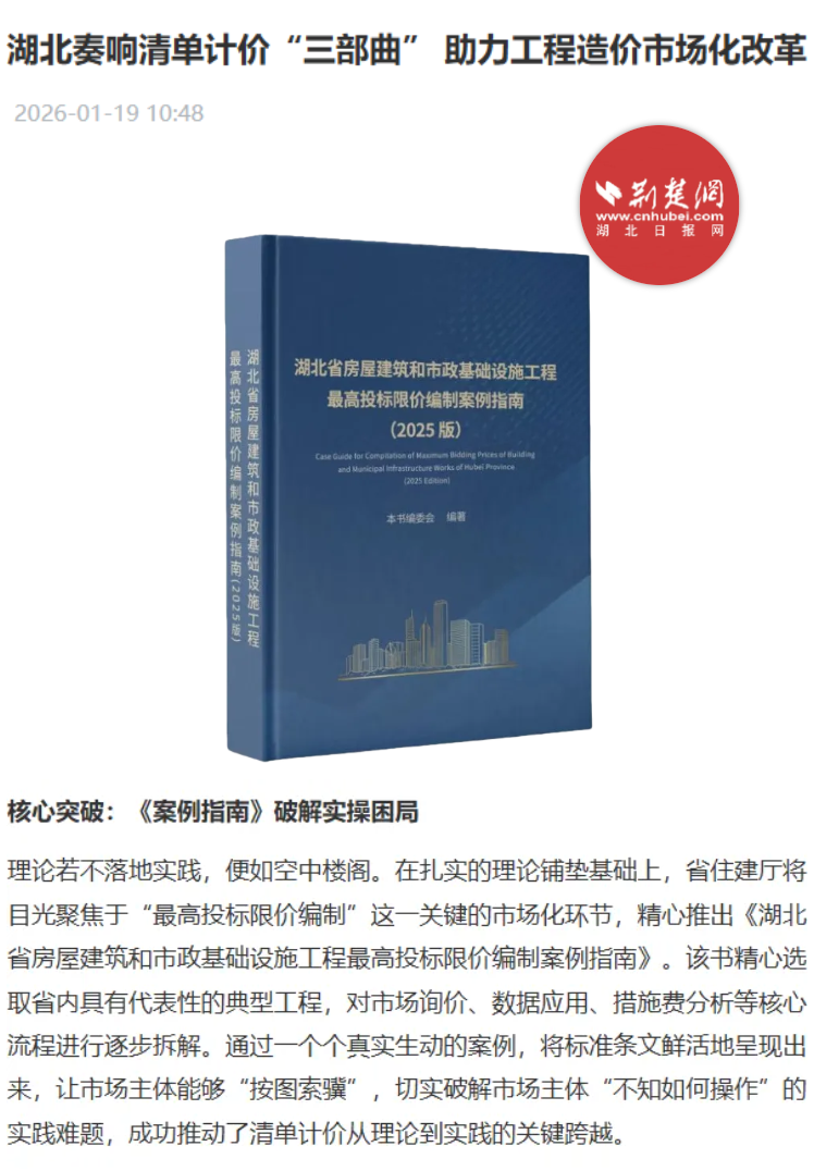 隨著《湖北省建設(shè)工程工程量清單計(jì)價(jià)指引(2026)》《湖北省園林綠化工程投資估算指標(biāo)(試行)》《湖北省房屋建筑和市政基礎(chǔ)設(shè)施工程最高投標(biāo)限價(jià)編制案例指南》以及《建設(shè)工程工程量清單計(jì)價(jià)(GB/T 50500—2024)及計(jì)算標(biāo)準(zhǔn)應(yīng)用與實(shí)務(wù)》等一系列規(guī)范與專(zhuān)著的陸續(xù)發(fā)布,湖北省圍繞國(guó)家標(biāo)準(zhǔn)《建設(shè)工程工程量清單計(jì)價(jià)標(biāo)準(zhǔn)》(GB/T 50500—2024)構(gòu)建的“理論解析—實(shí)操示范—規(guī)則指引”三位一體清單計(jì)價(jià)體系已正式形成,標(biāo)志著湖北省工程造價(jià)行業(yè)邁入市場(chǎng)化、規(guī)范化發(fā)展的新階段。近日,荊楚網(wǎng)與湖北日?qǐng)?bào)網(wǎng)專(zhuān)題刊登了題為《湖北奏響清單計(jì)價(jià)“三部曲”助力工程造價(jià)市場(chǎng)化改革》的報(bào)道。