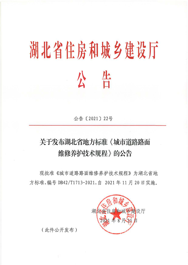 由我公司牽頭起草的湖北省地方標(biāo)準(zhǔn)《城市道路路面維修養(yǎng)護(hù)技術(shù)規(guī)程》(編號:DB42/T 1713-2021)于2021年7月20日由湖北省住房和城鄉(xiāng)建設(shè)廳、湖北省市場監(jiān)督管理局聯(lián)合發(fā)布,并于2021年11月20日起實施。
