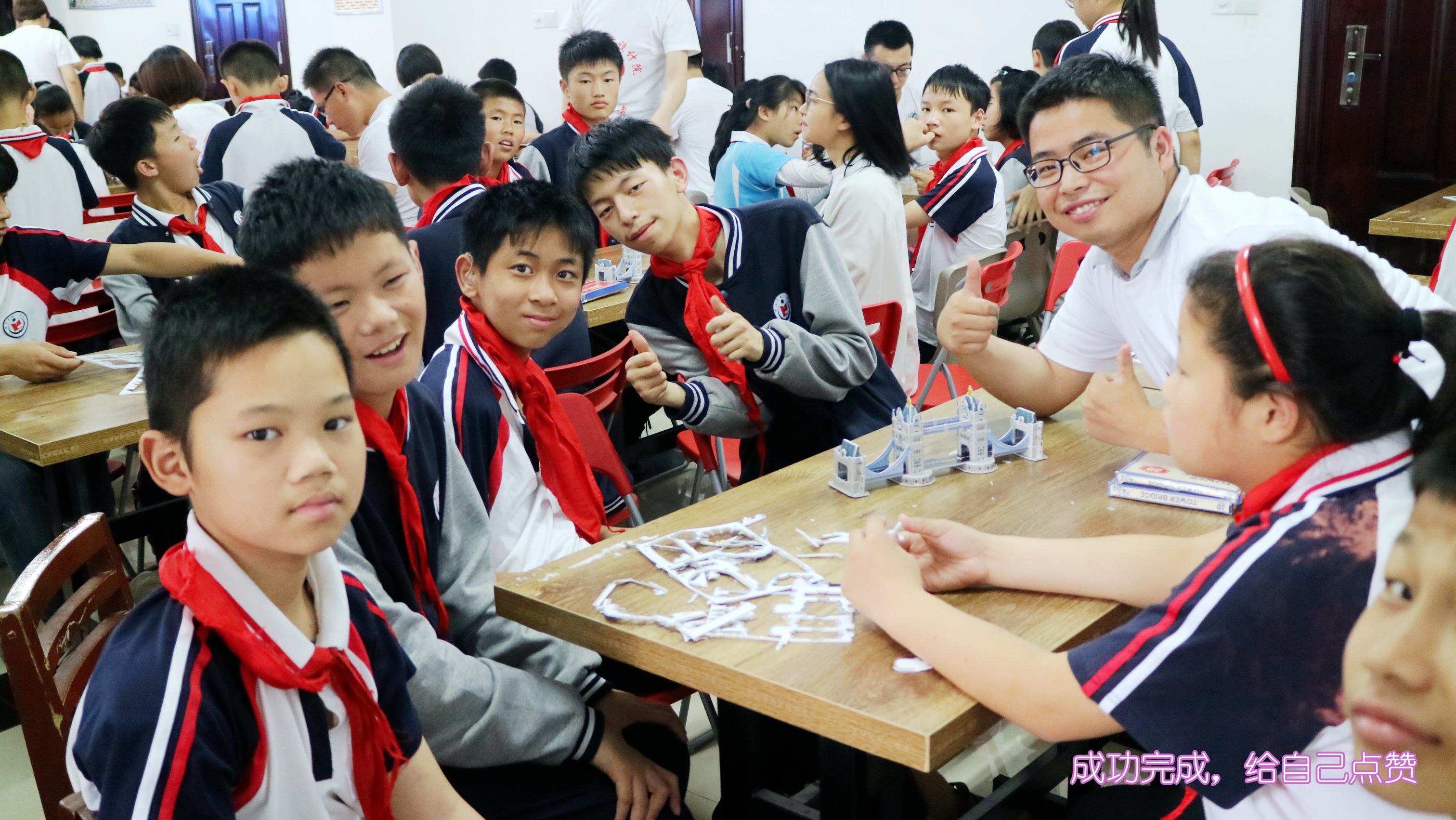 ??? 接下來(lái)的“愛(ài)心課堂”,志愿者們與孩子們共同協(xié)作,進(jìn)行倫敦雙子塔橋模型的拼裝。在志愿者的幫助下,孩子們小心地將圖板拆解下來(lái),按照說(shuō)明書(shū)的圖示認(rèn)真地開(kāi)始拼裝。遇到困難的步驟,志愿者們耐心地給他們講解、示范,在孩子們正確拼裝后,志愿者們會(huì)豎起大拇指對(duì)他們進(jìn)行鼓勵(lì)。很快,一座座模型便在他們手中完成了。最先完成的三組,志愿者們都給他們送上了獎(jiǎng)品。