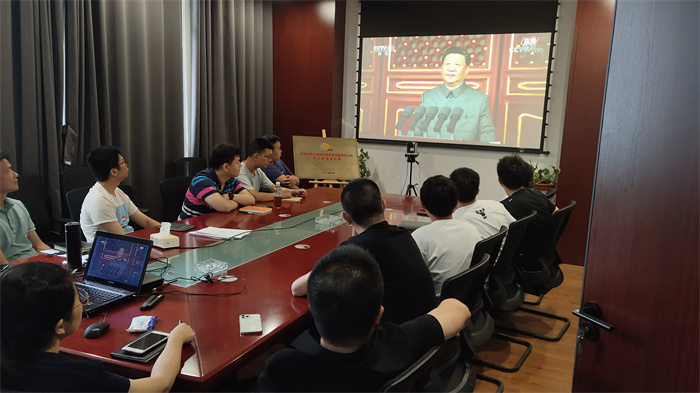 公司領(lǐng)導(dǎo)、總經(jīng)理助理、駐總院辦公的部門負(fù)責(zé)人、支部書記在西四樓會議室集中收看大會盛況。大會伊始,在轟鳴的禮炮聲中,國旗護(hù)衛(wèi)隊(duì)護(hù)衛(wèi)國旗颯爽登場;全場肅立高唱《國歌》,高亢的旋律瞬間營造了莊嚴(yán)肅穆的氛圍;少先隊(duì)員和共青團(tuán)聯(lián)合獻(xiàn)詞,回顧黨的光輝歷史,表達(dá)對黨的熱愛與忠誠。大會現(xiàn)場氣氛莊嚴(yán),激昂奮進(jìn),讓收看的人仿佛置身現(xiàn)場,親臨盛典。