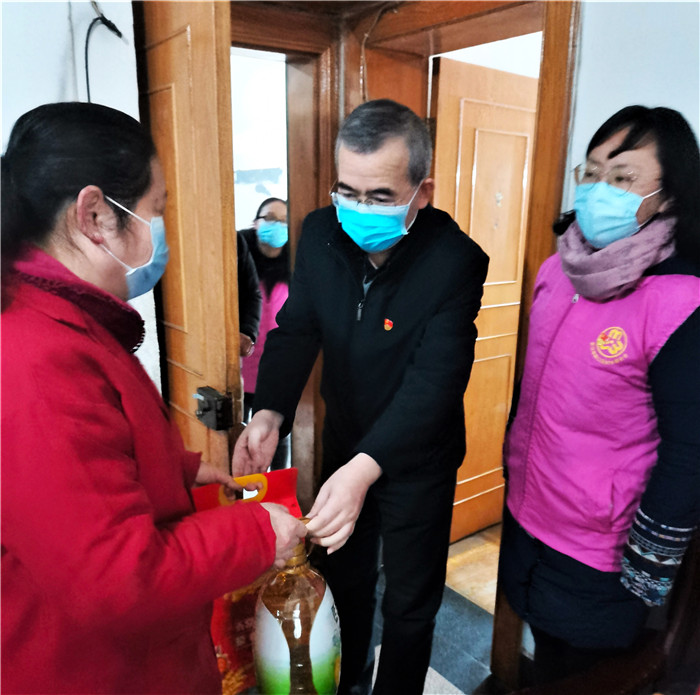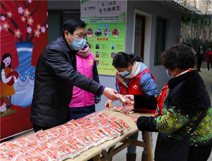 慰問(wèn)期間,恰逢社區(qū)正在開(kāi)展“臘八送福·甜蜜相伴”活動(dòng),談逢陽(yáng)一行也加入其中,熱情地為前來(lái)的社區(qū)居民發(fā)放臘八米,送上殷切的節(jié)日祝福,叮囑他們要做好防護(hù)。